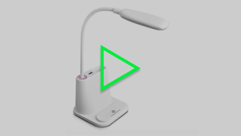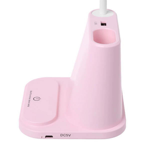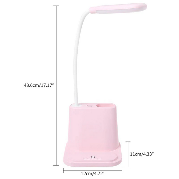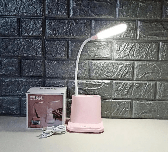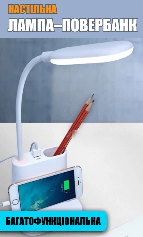 Настільний світильник поєднує в собі відразу кілька функцій: лампа, настільна підставка для телефону, тримач для ручок, олівців та іншої канцелярії, USB-порт для заряджання гаджетів.